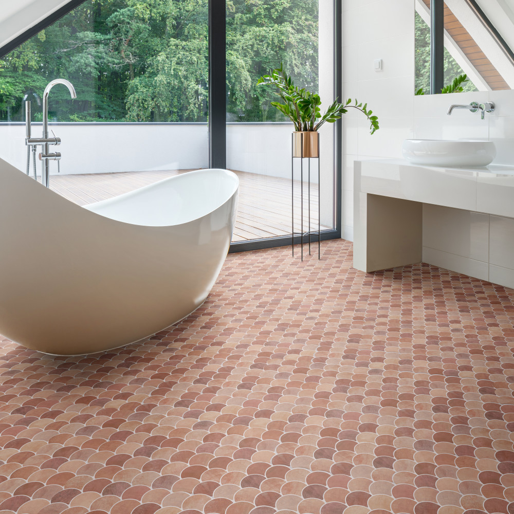 Available in both plain colors and marble-effects, the Scala Collection makes the most of this dynamic, inter-locking shape to truly stand out from more traditional tile forms. Although it dates back centuries, the fan-shaped tile experienced a significant revival during the Art Deco period. Merola’s range features this iconic shape in a plain white print, as a near-white Statuario marble, a gradient mix of aqua, sage, teal, and green in the Garden print, and a warm mélange of terracotta tones in Cotto.