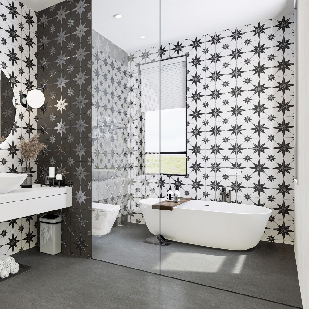 We have been able to use the same classic eight-pointed star motif across both interlining square and hexagonal tiles: offering two very different takes on this timeless shape. Equal thought has also gone into the pared down palette of white, black, and blue tones that convey the specific moods of different times of the day. A medium-sheen glaze brings out the full depth of the saturated glaze colors, while also emphasizing the traditional star pattern.